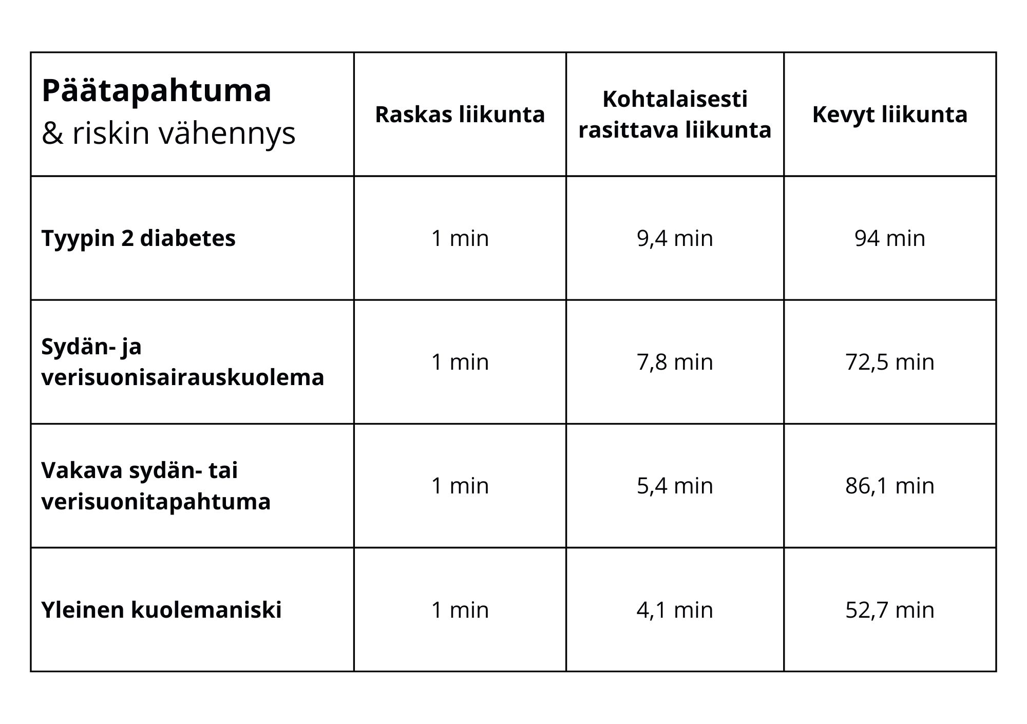 Tuoreen UK Biopankin aineiston (73 485 henkilöä) analyysissä, jossa seuranta-aika oli keskimäärin 8 vuotta, selvitettiin kiihtyvyysanturilla mitattuna eri tehoiseen liikuntaan liittyvää kuoleman- ja sairausriskiä. Taulukossa on tiivistetty kooste siitä, miten suuri 1) raskaan, 2) kohtalaisesti rasittavan tai 3) kevyen liikunnan määrä on yhteydessä samansuuruiseen sairaus- tai kuolemanriskin vähenemiseen.